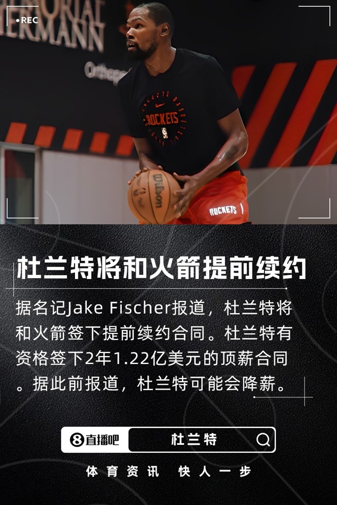 09月26日讯 据露天看台名记Jake Fischer报道,杜兰特将和火箭签下一份提前续约合同。